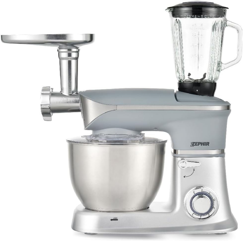 Zephir, Impastatrice planetaria professionale 7 lt con Frullatore e Tritacarne, Potenza 1300W, Frullatore in vetro 1,5lt, 6 velocitą, Ciotola acciaio inox 7L, Piedini antiscivolo, Blocco di sicurezza