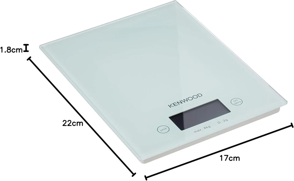 Kenwood DS401.W Bilancia Elettronica da Cucina con Piano in Vetro Bianco, Display Elettronico e Piedini Antiscivolo, Spegnimento Automatico, Doppio Sistema di Misurazione (gr/oz)